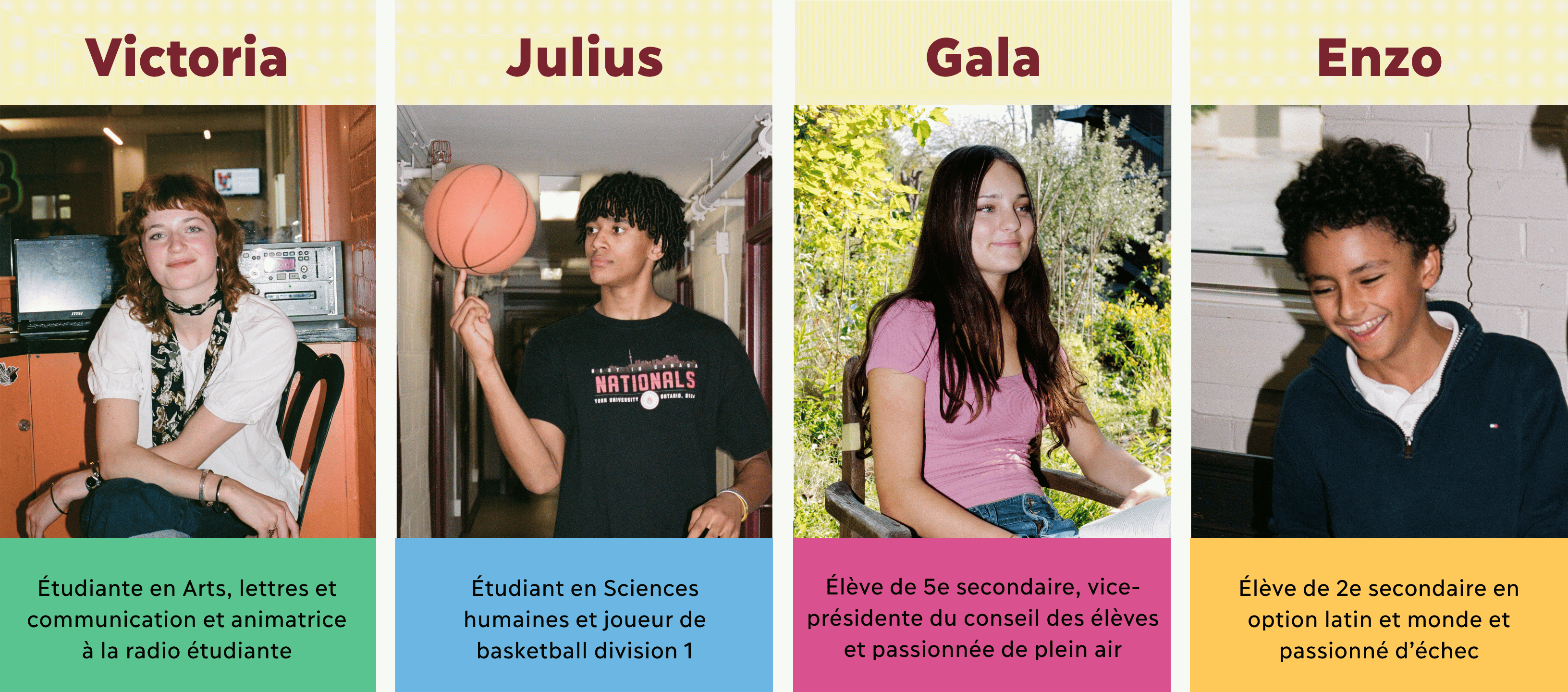 Suivez le quotidien d’une étudiante, d’un étudiant et de deux élèves du secondaire.